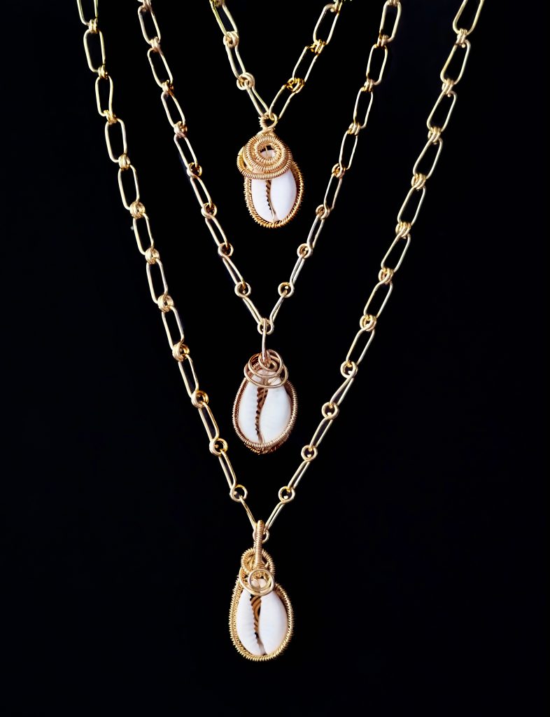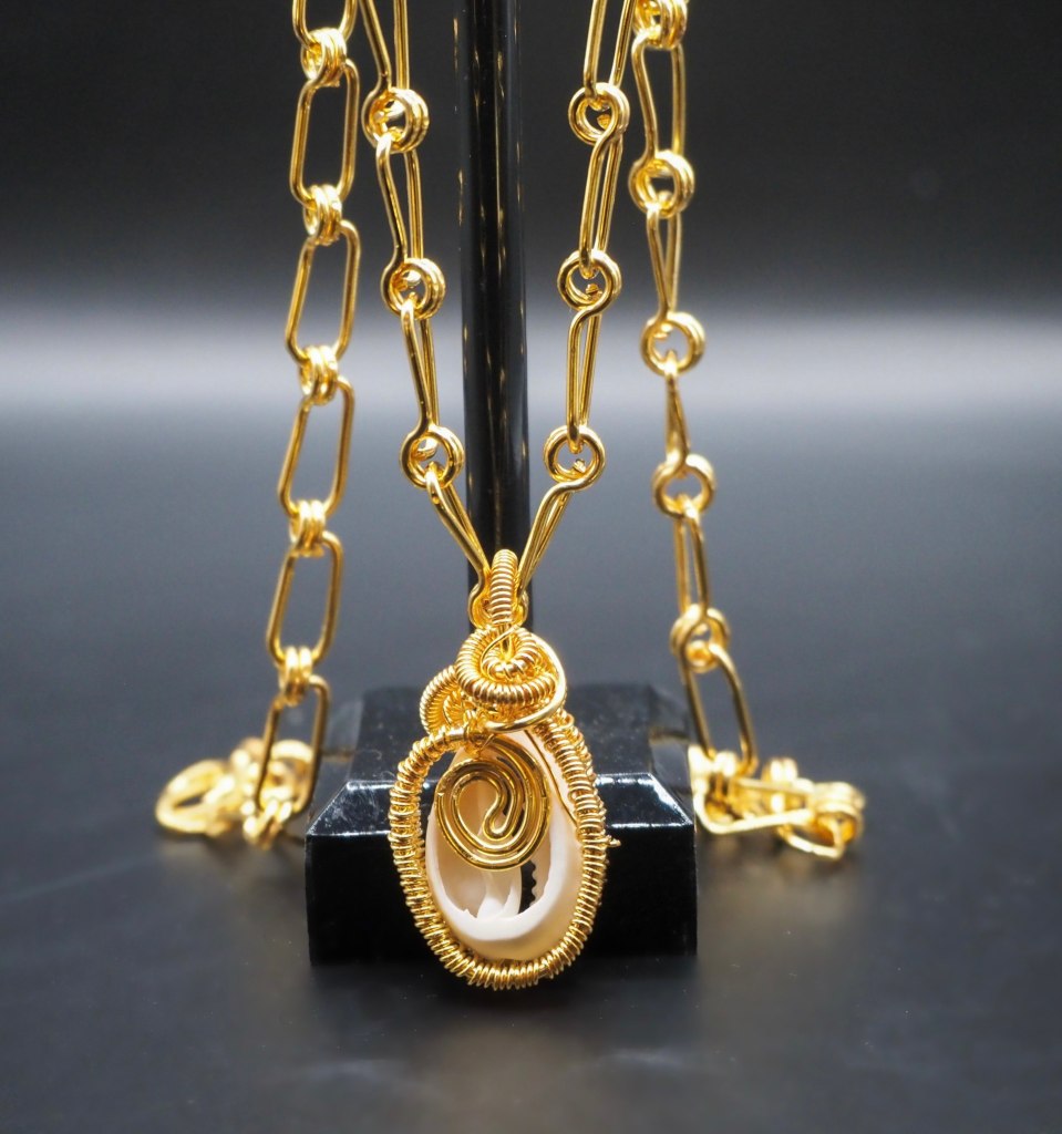 Chaine en bronze, alliage Plaqué/Or. Longueur: 20 cm Pendentif Cauris – coquillage naturel d’origine gabonaise